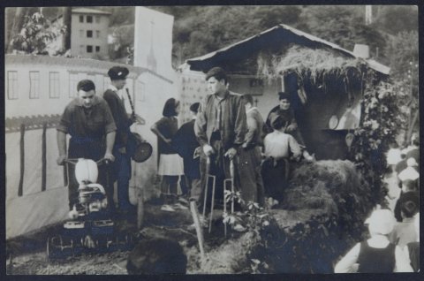 Baratza itxura duen karroza baten argazkia. Gainean aktoreak daude antzezten.