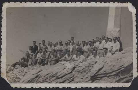 Mendizale taldea mendi baten puntan. Eskuinaldean gurutze bat dagoela antzematen da.