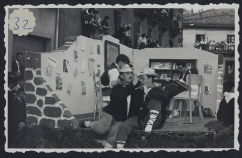 Bi gazte besarkatuta karroza baten gainean antzezten. Atzealdean irakurtzen ari dira. Balkoietan jendea antzezlana ikusten ari da.