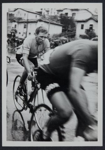 Bi txirrindulari ikusten dira karrera batean. Atzealdean etxebizitzak daude.
